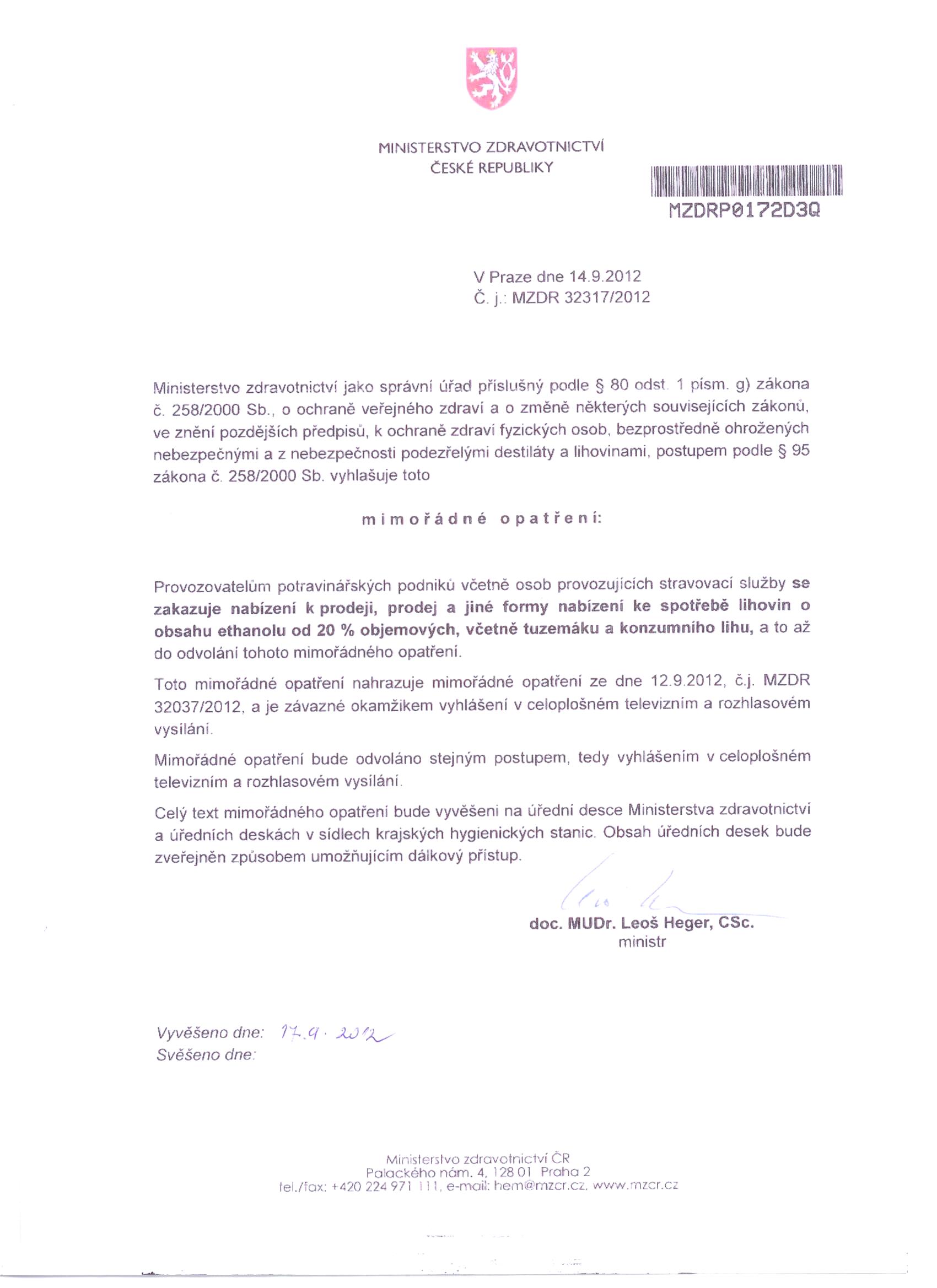 | Ministerstvo zdravotnictví - mimořádné opatření783053131.jpg | Mimořádné opatření Ministerstva zdravotnictví ČR - Zákaz nabízení k prodeji, prodej a jiné formy nabízení ke spotřebě lihovin | 227.1 Kb |