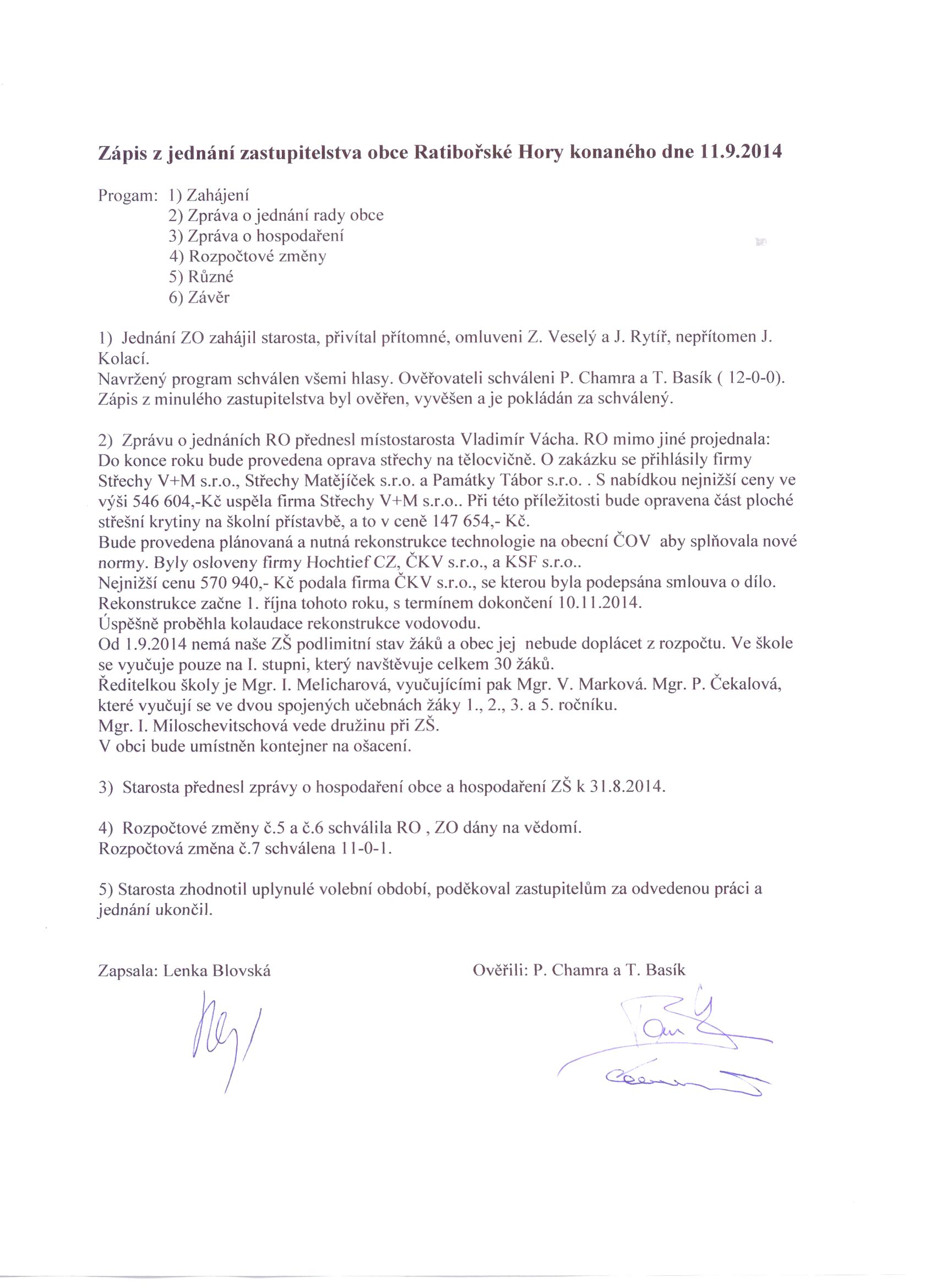 Zápis z jednání ZO Ratibořské Hory dne 11.9.2014